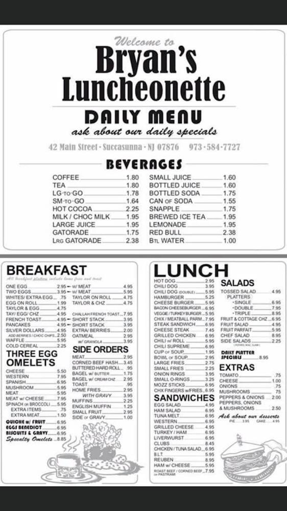 Welcome to Bryan's Luncheonette, a cherished family-owned gem in Roxbury & Randolph! Specializing in hearty breakfasts, satisfying lunches, and delightful brunches, we pride ourselves on creating a warm, welcoming atmosphere where every customer feels like family. Discover our daily specials, featuring scrumptious soups and local favorites. Whether you choose to dine in our cozy space or opt for convenient takeout, our friendly staff is ready to serve you. Located at 42 Main St, Succasunna, NJ, we invite you to experience the comfort of Bryan's, where great food and community come together. Call us at +1 973-584-7727 today!
